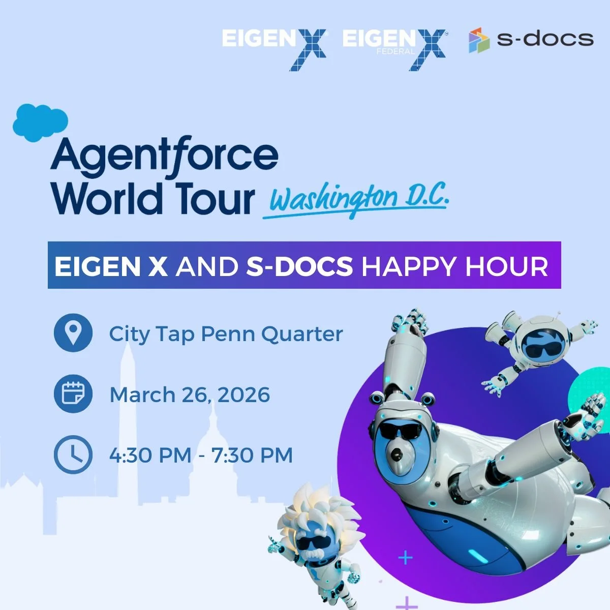 If you’re attending Agentforce World Tour DC, don’t miss the chance to unwind and connect with the community at our Eigen X + S-Docs Happy Hour.