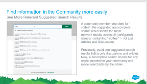 - Get More Granular Information with Improved Search Reporting ( Good feature to fine tune the content on search)We now count every time Salesforce fetches results. Search reports show which search terms produced no results in the community and which ones did. Admins can also see the average number of results per search term and which searches were confined to a specific subset of records. Previously, search queries were counted every time a user entered a search query and pressed Enter, clicked Search, or selected a search option in autocomplete results. This would help your community moderators to fine tune content to fit the searches done by students.