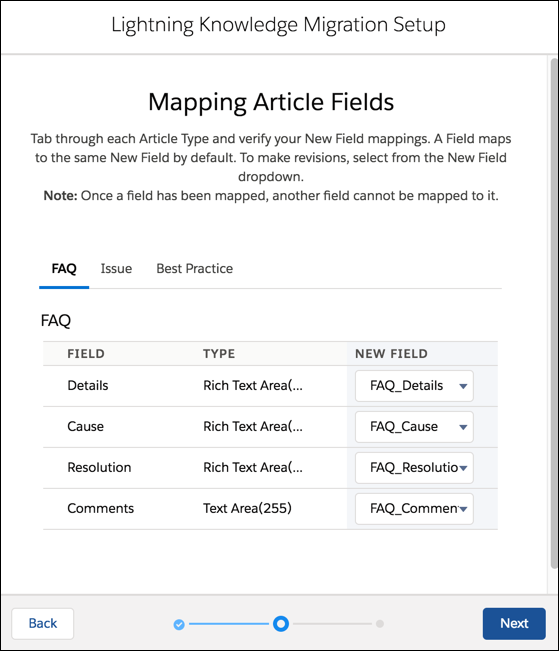 If you have several different article types in classic, you will be migrating these to one object in lightning with several record type, so it will be important to find and map similar fields across the knowledge article types. In the example below the 3 different record types are FAQ, Issue, and Best Practices. If you click on the different article types, you can map them to similar or same fields shared across each of those record types, which would cut down the need from 12 fields that were created across the different classic knowledge article types to 4 fields on the new lightning knowledge object shared across 3 record types. You can ask Salesforce to enable the Lightning knowledge migration tool which can do the mapping and data migration for you.