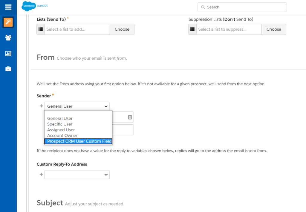 When selected as a sender or custom reply-to option, you can specify which CRM User Custom Field you wish to send on behalf of. This means you can have more than one type of CRM User Custom Field data syncing to Pardot if you’d like to. The catch is that this field will only populate in the drop-down menu as a sender or custom reply-to option if configured, otherwise, a Pardot user will not see it.
