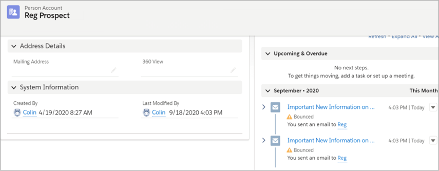 The Activity Timeline bounce warning now also comes up when emails generate soft bounces. A soft bounce is a temporary issue, such as when a recipient mailbox is full. Now reps know that their email did not reach the recipient but don’t have to confirm or update the recipient’s email address, unlike when the email address generated a hard bounce.
