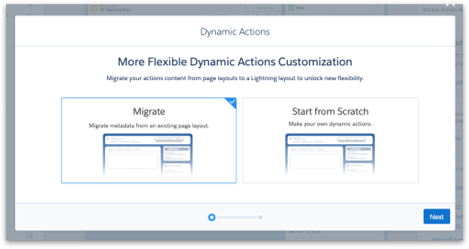 With dynamic actions, easily configure actions that should show up for specific sets of users without having to create a brand-new page layout. Need different actions based on the stage or step of a process? Use dynamic actions to create dynamic action experiences to streamline user productivity and simplify your pages. Now GA on custom objects, and Accounts, Contacts, Leads, Opportunities, and Cases for Desktop and on Custom Objects in the Mobile app.
