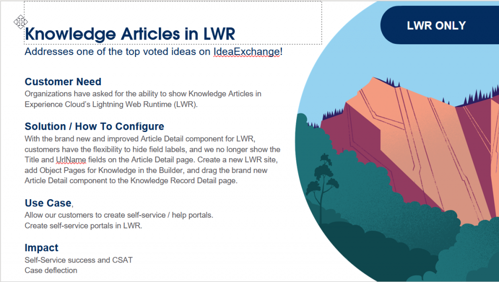 Experience cloud – Expose Knowledge articles in your LWR self-service portals for your distributor, reseller, and customer portals.