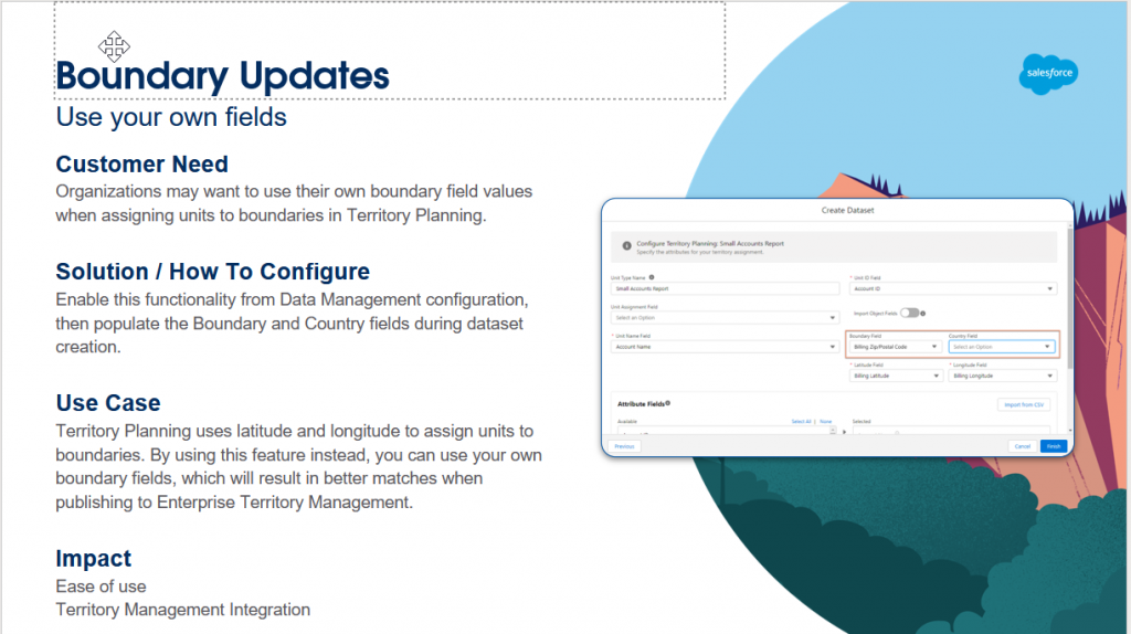 Territory Planning uses latitude and longitude to assign units to boundaries. By using this feature instead, you can use your own boundary fields, which will result in better matches when publishing to Enterprise Territory Management. This is a good feature for Manufacturers who do not use zip codes and use a combination of zipcodes or loose geographical areas to define for their sales team or field service teams.