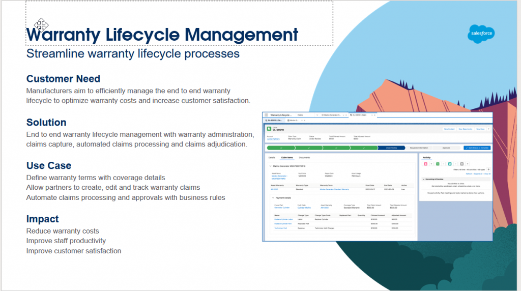 Manufacturing Cloud – End-to-end warranty lifecycle management with warranty administration, claims capture, automated claims processing, and claims adjudication.