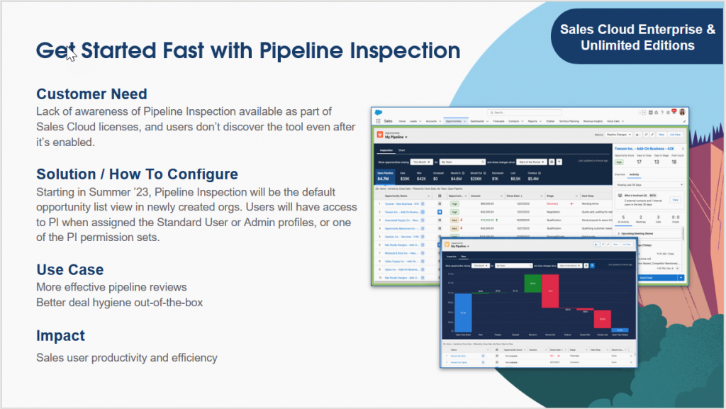 Pipeline inspection – Have this feature turned on immediately and delight your sales leadership to view pipeline changes in a Kanban view to track opportunity changes.