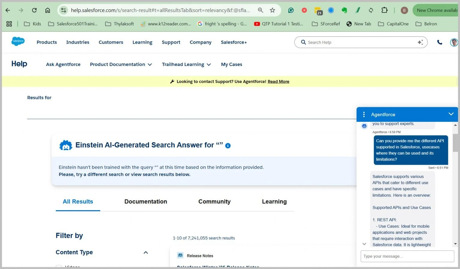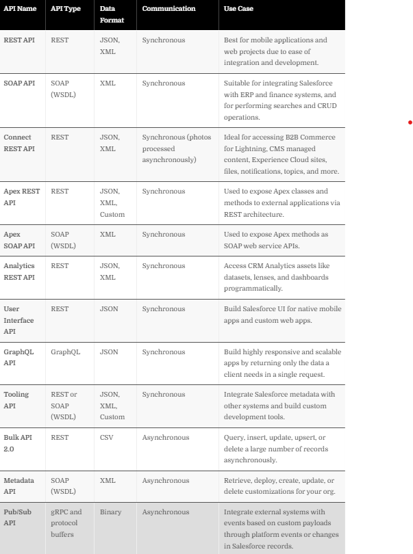 There is also a need to know all the types of API in Salesforce and how they can be used for effective usecases. For this, I actually used Agentforce which is available in Salesforce help. All you have to do is type a prompt which says” Give me the different API supported in Salesforce, usecases it can be used and its limitations.” Below is a screen shot which it provides for you.