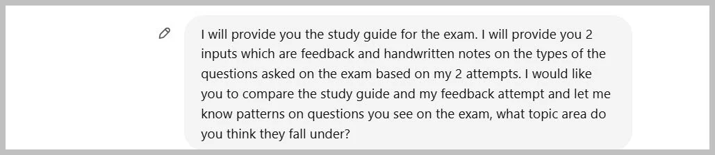 I created a prompt in ChatGPT, which compared the study guide and my exam questions and created a detailed analysis of which topic and subtopic areas in the study guide I did well and which did not. This helped me focus on the weak areas and do it better. I have attached the prompt below, study guide and the analysis the tool created which helped me.
