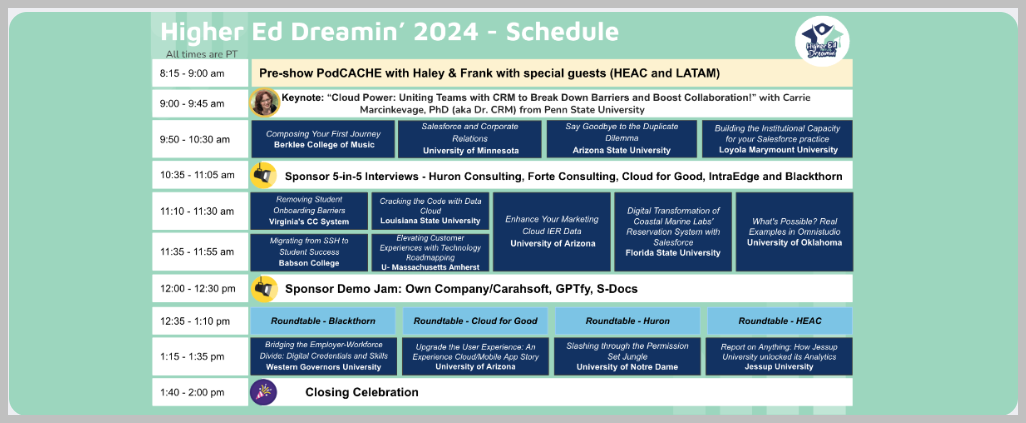 If you are a higher ed user using Salesforce CRM for a while and struggle with measuring impacts on your CRM investment, trying to learn best practices on how other universities are using Salesforce for admissions, marketing and student success and figure out how to leverage generative AI for your university, there is a fantastic online event this week on 11/7 done by Higher Ed Dreamin which you should register and attend.