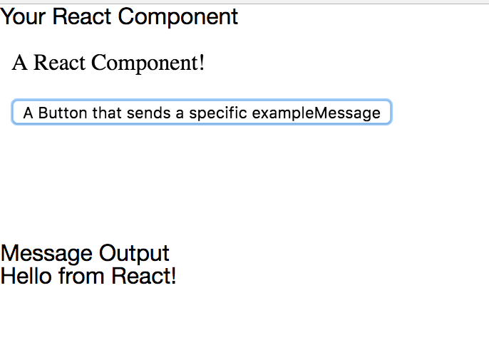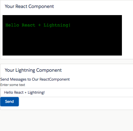 </lightning:card> <lightning:card title="Your Lightning Component"> <p>Send Messages to Our ReactComponent</p> <lightning:input name="message" label="Enter some text" value="{!v.message}"/> <lightning:button variant="brand" label="Send" title="Send action" onclick="{! c.handleSendClick }" /> </lightning:card> </aura:component>